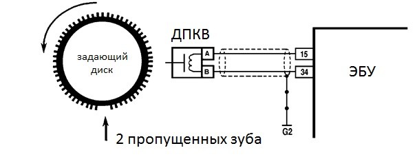 Для правильной работы ДПКВ применяются стандартизированные синхродиски. Они разделяются на 60 зубьев, которые расположены через каждые 6°. Чтобы обеспечить синхронизацию датчика с блоком управления и связными элементами, а также задать стартовую точку для отсчета оборотов коленвала, в определенной точке синхронизирующего диска нет пары зубцов (синхронизирующий диск типа 60-2).