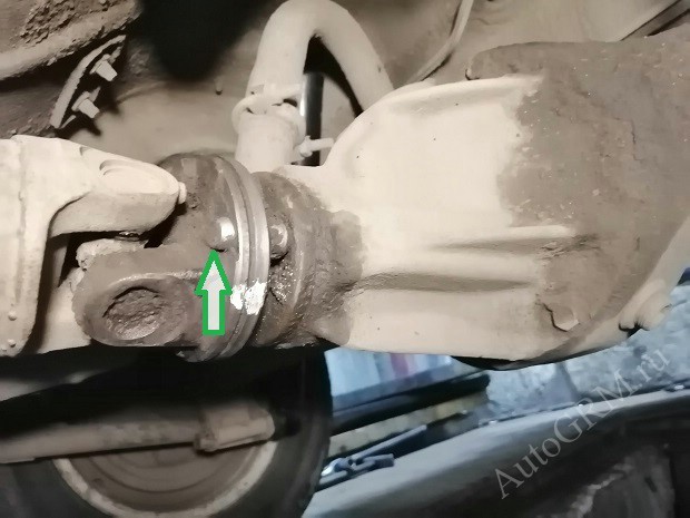 Для начала ставим две метки на кардане и хвостовике, чтобы при сборке все поставить на своё место. Я использую обычный канцелярский штрих. Откручиваем четыре гайки на 13, если болты начнут проворачивается их легко можно заклинить, вставив плоскую отвертку (место установки показано зеленой стрелкой). Болты там хитрые без граней.