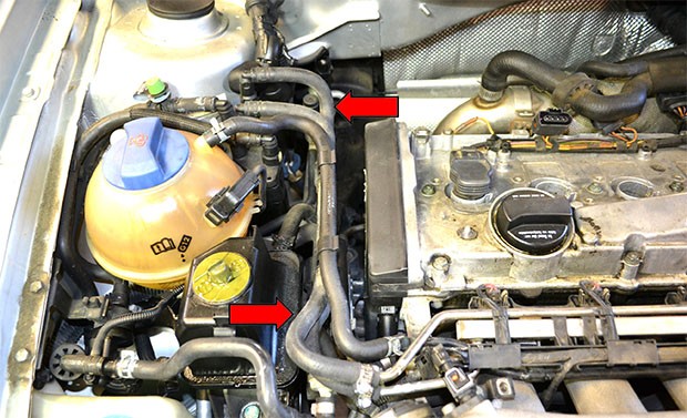 Для удобства замены ремня ГРМ советуем снять шланги, которые указаны красными стрелками. Перед снятием не забываем промаркировать шланги и места, куда они крепятся.