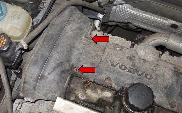 Вначале снимаем крышку двигателя на головке блока цилиндров. Откручиваем 2 болта, отмеченных красной стрелкой. После этого необходимо снять две клипсы.